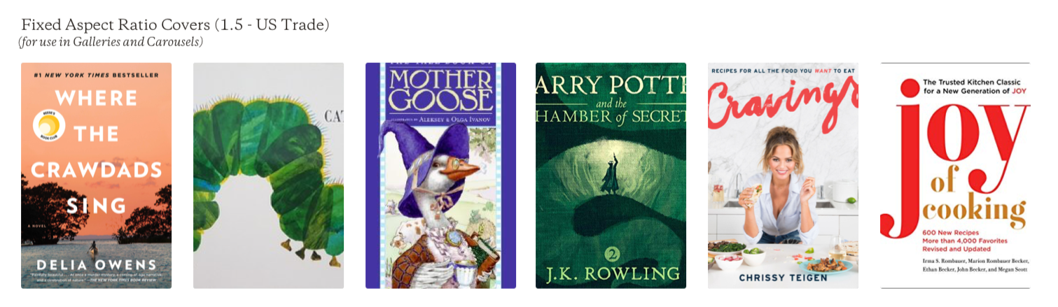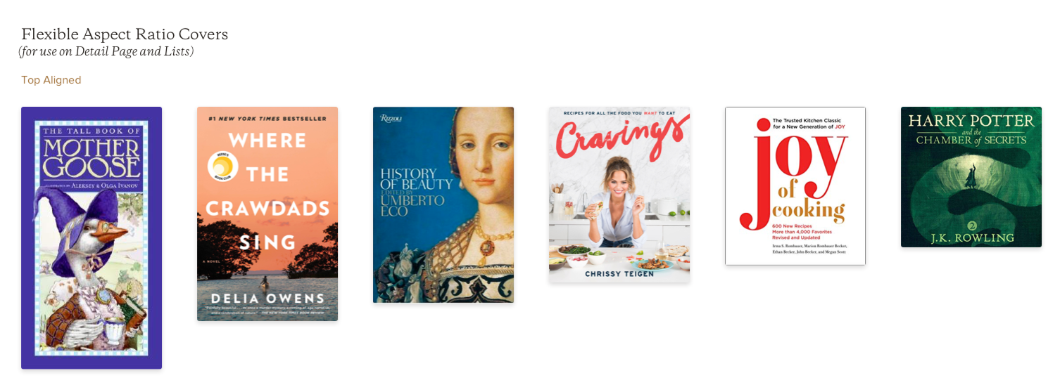 Book covers come in all different aspect ratios, so we developed two versions of the book image component: one that displayed the unaltered image, and one that cropped all covers to a designated average, for use in carousel treatments.