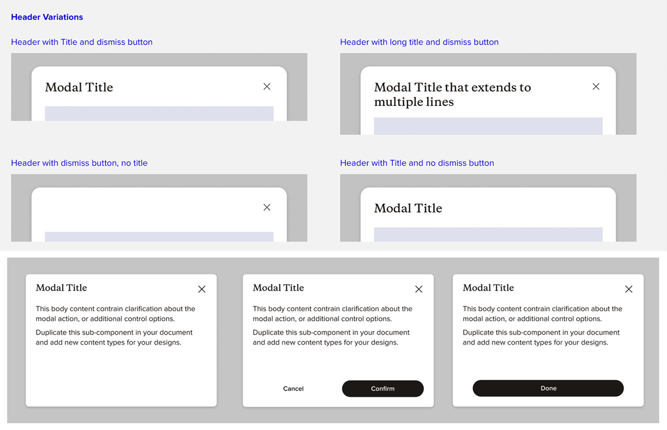 One example is the modal, or pop-up container, which was built extensibly to support the Shelf button, error messages, overflow menus, and login interstitials.